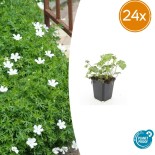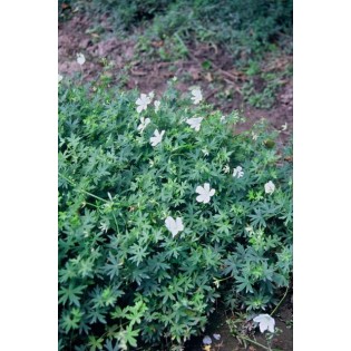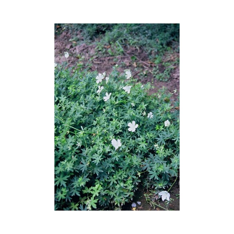 Geranium sanguineum 'Album' is an elegant, hardy perennial featuring striking white flowers that beautifully contrast with its dark green, crinkled foliage. This low-maintenance plant blooms from late spring to early autumn and is perfect for borders, rock gardens, and as ground cover. It thrives in both sun and partial shade while attracting butterflies. Add a touch of refinement and beauty to your garden with 'Album'!