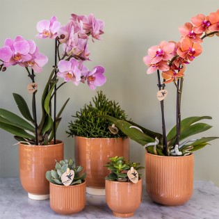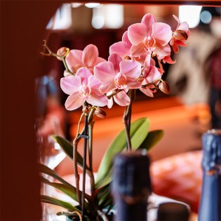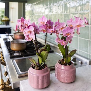 • Meet the Treviso orchid, with its rare and elegant dusty pink blooms. Treviso is part of our Jewel family – did you know this collection only includes orchids with unique and exceptional flower colors? The warm pink shade makes this orchid a true eye-catcher in any interior. This orchid comes in a 9 cm pot and grows 2 to 3 stems. With a height of approximately 35 to 45 cm, it's perfect for styling on a coffee table, kitchen counter, or side table. The Phalaenopsis Treviso pairs beautifully with white, nude, or pink decorative pots (9 cm pot size), adding a graceful and elegant touch to your home. Looking for a larger Treviso? We also offer it in a 12 cm pot size. The orchid comes with 2 or 3 sturdy stems, depending on current availability. As we work with living products, slight variations in the number of stems or flowers may occur.
