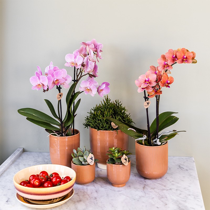• Meet the Treviso orchid, with its rare and elegant dusty pink blooms. Treviso is part of our Jewel family – did you know this collection only includes orchids with unique and exceptional flower colors? The warm pink shade makes this orchid a true eye-catcher in any interior. This orchid comes in a 9 cm pot and grows 2 to 3 stems. With a height of approximately 35 to 45 cm, it's perfect for styling on a coffee table, kitchen counter, or side table. The Phalaenopsis Treviso pairs beautifully with white, nude, or pink decorative pots (9 cm pot size), adding a graceful and elegant touch to your home. Looking for a larger Treviso? We also offer it in a 12 cm pot size. The orchid comes with 2 or 3 sturdy stems, depending on current availability. As we work with living products, slight variations in the number of stems or flowers may occur.