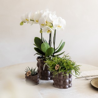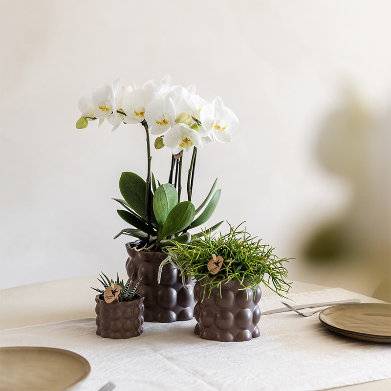 Bring calm into your home with the Cotton Brown plant set, part of our Slow Living collection. This set includes a white Phalaenopsis orchid ‘Ghent’ and two succulents, each in a different pot size (⌀6, ⌀9 and ⌀12 cm).