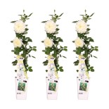 • 'Rosa Crazy in Love Vanilla' is a popular creamy white climbing rose with fresh green shiny leaves. For hundreds of years, roses have been one of the best-known and most frequently planted groups of plants. The rose has a symbolic value in various cultures. Already in ancient times, temples and palaces were decorated with them. The rose begins flowering in June and continues flowering until the first frost in October or November. To encourage flowering, it is advisable to remove old and spent flowers. The climbing rose likes a sunny spot and for the best growth you should cut it back to about 30 centimetres above the ground every other year.