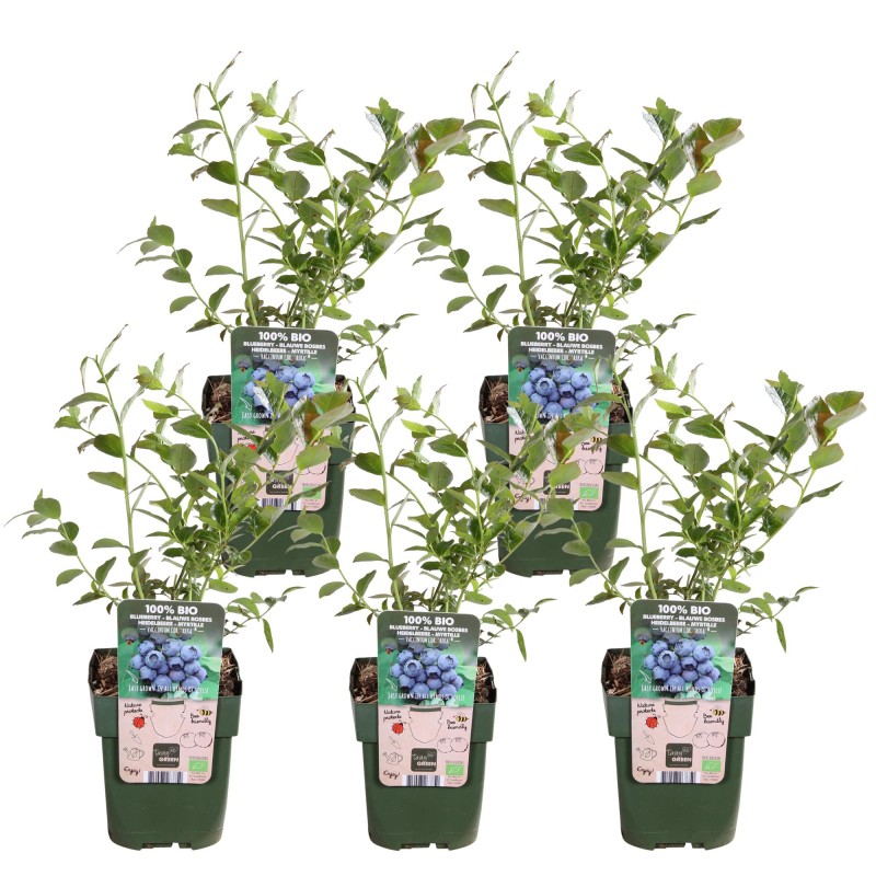 • Tasty Green, 100% organically grown fruit. This means that only plant and animal materials have been used during cultivation. The pot and label are made of recycled plastic and are therefore a clean solution for the environment. 'Vaccinium corymbosum Reka' is also known as blueberry. It is a well-known variety that produces many, large and sweet fruits. It grows well on any type of soil. The shrub has thin branches and small fresh green leaves. The fruits are firm, light blue with a good taste. They can be picked from mid-July to mid-August. Fresh blueberries can be kept for a week and you can also freeze them. The blueberry blooms in clusters and the flower is white-cream to pink in colour. Flowering takes place in the first half of May. This plant is completely self-pollinating and requires almost no care. The leaves turn a beautiful orange-red in autumn and then fall off.