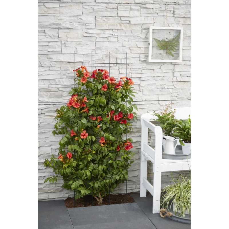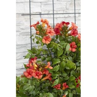 • Campsis Summer Jazz Fire Trumpet' is a winter-hardy Chinese trumpet which flowers abundantly and for a longer time when there is a lot of sun. The red-flowered Campsis grows more compactly than other species in the Summer Jazz series, up to 3 metres high. The late-summer bloomer tends to form a shrub. If you want your Campsis to climb, it is useful to support it with a climbing frame at the beginning of its growth. This Campsis is a self-adhesive climber, which means that small adhesive roots are formed from the branches. These adhesive roots will attach themselves along the wall or fence.
