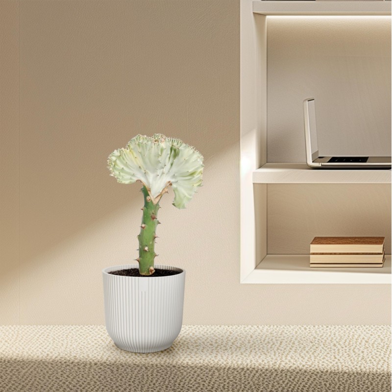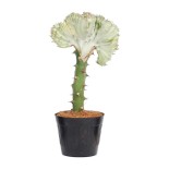 • The Euphorbia lactea Cristata, also known as the 'Coral Cactus', features a unique wavy shape resembling coral. The plant is bright green and can grow up to 30 cm tall. The leaves are thick and fleshy, adding an interesting texture to its appearance.