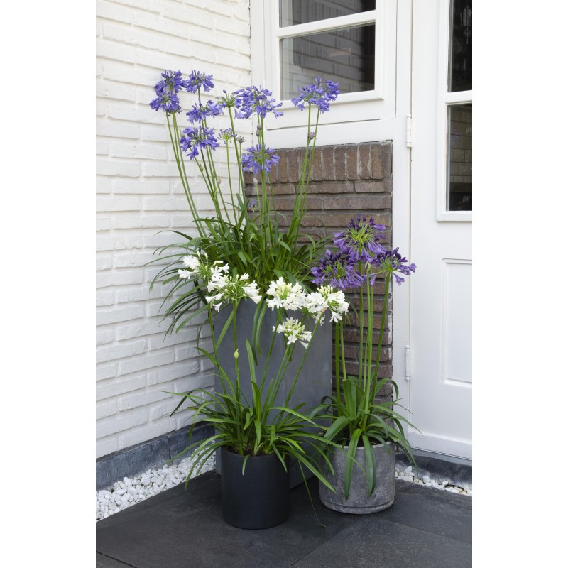 • The Agapanthus Ever White has large, deep blue flowers and is distinguished by its early and rich flowering. The Agapanthus starts flowering in spring and re-flowers during the summer. This beautiful perennial prefers a sunny spot in well-drained soil. The sun worshipper is easy to care for because of its drought and heat resistance, and is Hardy to -15 ºC.