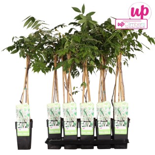 • 'Wisteria floribunda Alba', also known as white rain, is a white-flowered variety of the wisteria. This variety grows and flowers in the same way as the wisteria, but is just that little bit more exclusive! It is a climbing plant with beautiful, very long, pendulous flower clusters that appear en masse in May-June. There may also be an after flowering in September. It is a fast-growing climber that can reach a maximum height of 10 metres. To keep the wisteria in the best possible shape, it is best to lead it along a pergola, fence or rack. Make sure there is a sturdy support, to which the branches are attached so that it can climb towards the sun. It is also important to prune the plant regularly during its growth or in early spring. Prune preferably twice a year.