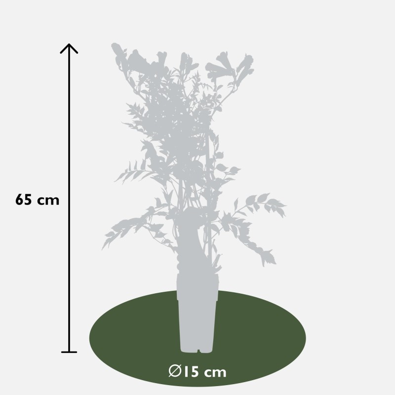 • Campsis Summer Jazz Gold Trumpet' is a Chinese trumpet that flowers abundantly and for a longer time when there is a lot of sun. The Chinese trumpet is very Hardy if placed in a sheltered spot. The yellow-flowered Campsis grows more compactly than other species in the Summer Jazz series, to a maximum height of 3 metres. The late-summer bloomer tends to form a shrub. If you want your Campsis to climb, it is useful to support it with a climbing frame at the beginning of its growth. This Campsis is a self-adhesive climber, which means that small adhesive roots are formed from the branches. These adhesive roots will attach themselves along the wall or fence.