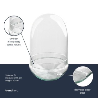 • A stylish eye-catcher with a unique design: that’s Egg XL. This closed terrarium, 30 cm high, comes in an elegant egg shape and is sealed with a full glass dome. Perfect as a centerpiece on a sideboard, table or windowsill. Thanks to its closed form, Egg XL creates a low-maintenance ecosystem where plants can thrive on their own. Specifications • Height: 30 cm • Material bottle: clear glass, made from recycled glass • Closure: glass dome Due to the recycling process of the bottles, small imperfections such as air bubbles may occur in the glass. In most cases these are hardly visible, do not affect the quality of our glassware and will hardly be noticeable once the terrarium is filled. Egg XL is the ideal terrarium for anyone who loves elegant design, simplicity and a touch of nature at home.