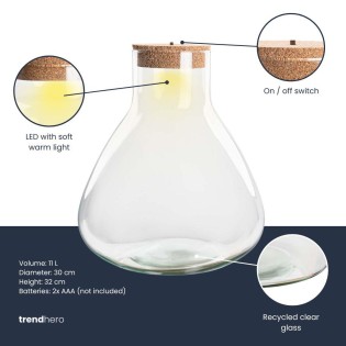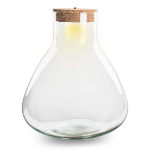 • The Sam XL Bottle Garden is a spacious terrarium bottle that combines style and atmosphere. Made from recycled glass and finished with a cork lid, this closed terrarium is a sustainable home accessory. With the included LED cork, you can enjoy a fresh green eyecatcher during the day and a warm, cozy light source in the evening. Specifications • Height: 32 cm • Diameter: 30 cm • Model: Sam XL • Includes: LED cork (runs on 2 AAA batteries, not included) • Material: recycled glass with cork lid • Application: perfect for houseplants, terrarium projects, or as a decorative object • Maintenance: low-maintenance and easy to use With the Sam XL, you bring a stylish and sustainable terrarium into your home that fits any interior. Perfect as a statement piece in the living room, in the office, or as a unique gift for plant lovers.