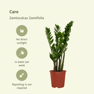• The Zamioculcas Zamiifolia is an easy, green houseplant. This houseplant is native to Zanzibar, Kenya and Madagascar. The plant is also known as the ZZ plant. Give the Zamioculcas a spot in semi-shade. A little more sun is not a problem either. The leaves of the Zamioculcas grow toward the light. Turn the plant regularly to avoid crooked growth. When the leaves point toward the ceiling, you know the plant is in the perfect spot. This houseplant stores water in the stem and in the roots. Because of this, you don't need to water often. Once every two weeks in summer and once every 3 weeks in winter is sufficient. Please note that plants are a live product and may vary from the photo and description. Our plants come in a plastic grow pot. All plants are packaged and shipped directly from the nursery.