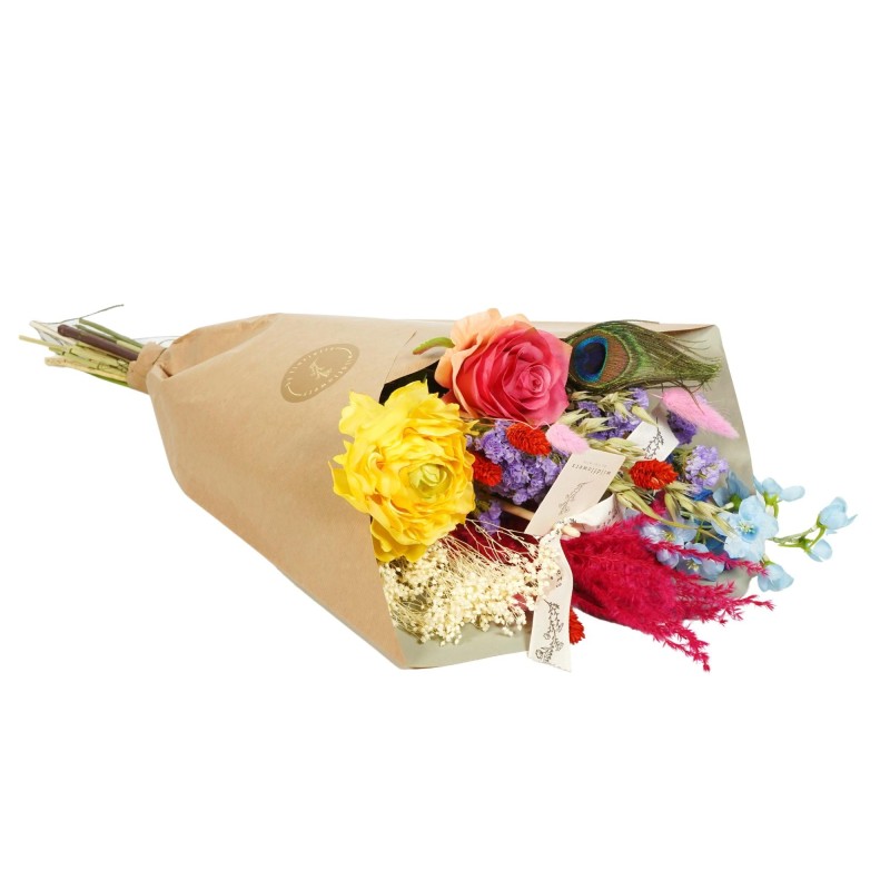 • This beautiful combination of dried and silk flowers provides a colorful and natural appearance. The flowers come in various shades such as pink, white, and yellow, while the leaves are a lush green. The flowers are carefully arranged, giving them a full and vibrant look.