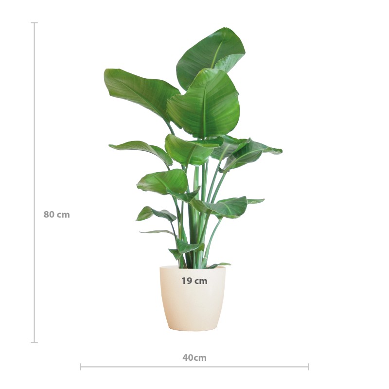 • The Strelitzia nicolai, also known as the bird of paradise plant, is a large green houseplant that loves sunlight. With its beautiful large green leaves it perfectly fills the empty corner of a room. Originally from South Africa, the Strelitzia can grow up to 10 meters high in full sun! This houseplant is also known for its beautiful flowers that grow in the wild. The flowers resemble birds of paradise, which has given the plant the name 'bird of paradise plant' or 'bird of paradise'! Unfortunately, this houseplant will not bloom very quickly indoors, but the beautiful large green leaves are a pleasure in themselves. Occasionally cracks may appear in the leaf. This is completely natural for the bird of paradise plant and is nothing to worry about. Delivered together with a Viber pot. The pot is made of bioplastic with elephant grass from Dutch soil. The pot is biodegradable and naturally colored by chalk. Due to the light natural color, this pot fits in different interiors.