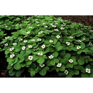 • **Cornus canadensis**, also known as Canadian dogwood, is a stunning ground cover with glossy green leaves and charming white flowers. This versatile plant thrives in shady gardens and grows low, creating a lush carpet effect. It’s an excellent choice for achieving a natural look while attracting butterflies and bees. With its evergreen qualities, it keeps your garden vibrant year-round. Perfect for gardens, parks, or as an addition to borders!