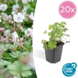 The **Geranium cantabrigiense 'Biokovo'** is a low-growing ground cover (10-15 cm) that blooms with delicate white-pink flowers in May and June. This low-maintenance plant thrives in almost any soil and spreads through root shoots. Perfect for borders, edges, or as ground cover. No pruning required!