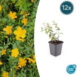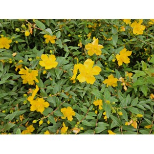 Hypericum dummeri* 'Peter Dummer', also known as St. John’s wort, is a versatile, low-growing shrub perfect for vibrant ground cover and border planting. This compact plant has attractive, fresh green foliage that remains beautiful all season, producing abundant bright yellow flowers in summer with striking, star-shaped stamens. These blooms attract bees and butterflies, supporting biodiversity in the garden. ‘Peter Dummer’ is hardy and thrives in both full sun and partial shade, making it suitable for a variety of garden styles. Low-maintenance and drought-tolerant, it retains its ornamental value even in dry periods. Ideal for adding color and structure to the garden, with a long flowering period and a natural, playful charm.