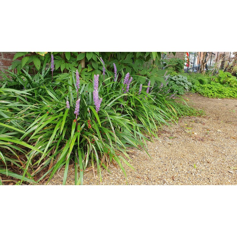 **Liriope muscari 'Ingwersen'** is a beautiful, evergreen plant perfect for use as groundcover or edging. With its dark green, grass-like leaves and striking purple flower spikes in late summer, this plant adds an elegant touch to any garden. **'Ingwersen'** is hardy, low-maintenance, and thrives in both sunny and shady spots, making it versatile for various garden conditions. Add a fresh, vibrant atmosphere to your garden year-round with **Liriope muscari 'Ingwersen'**!