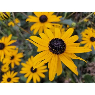 • The **Rudbeckia fulgida 'Goldsturm'**, commonly known as Black-eyed Susan, is a stunning perennial with vibrant golden-yellow flowers and a dark center. Blooming from July to October, it attracts bees and butterflies, adding a lively summer touch to your garden. Perfect for borders, low-maintenance, and highly winter-hardy. Thrives best in a sunny spot!