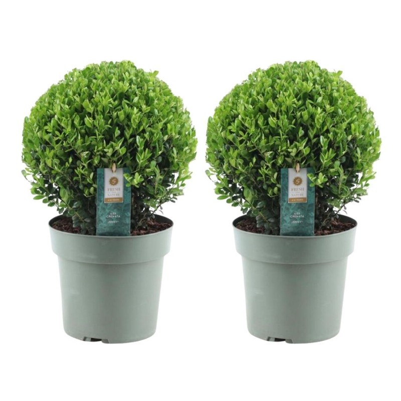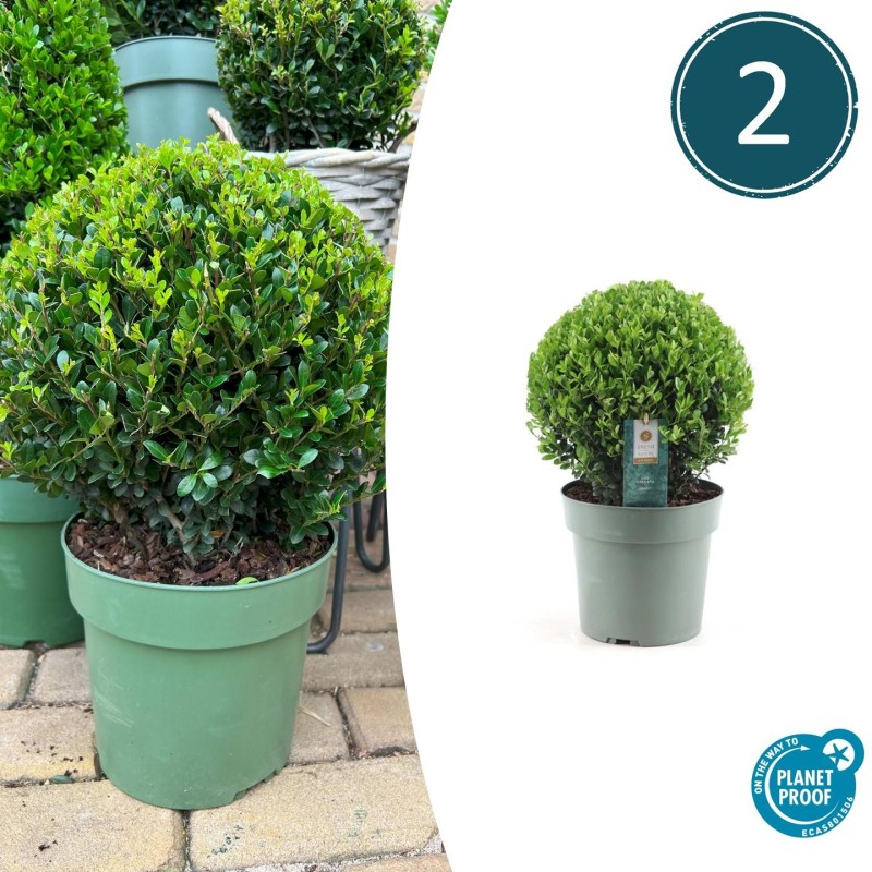 This set of two Ilex crenata 'Jenny' balls (20 cm) is the ideal alternative to the traditional boxwood ball. With their compact growth, glossy dark green leaves, and hardy nature, they remain a stylish eye-catcher in the garden, on the terrace, or at the entrance all year round.