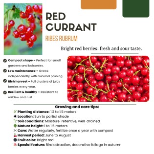 Start your organic gardening project with our organic red currant bush (Ribes rubrum). This plant is delivered in a 13 cm pot and has a starting height of 20-25 cm, indicating that it can grow to a final height of up to 1.5 meters.