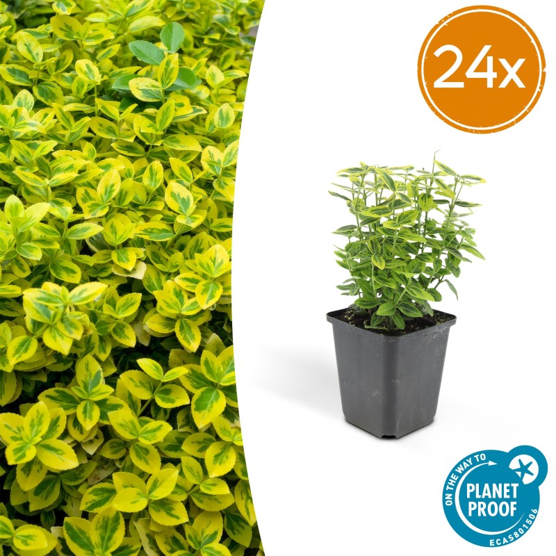 The **Euonymus fortunei 'Emerald 'n Gold'** is a versatile, evergreen shrub with striking yellow-green foliage. This compact plant (40-50 cm tall) is perfect for low hedges, borders, or as a stand-alone feature. It thrives in any soil type and grows well in both sun and shade. Easy to maintain, it can be pruned in early spring or around June. Add color and texture to your garden with this low-maintenance eye-catcher!