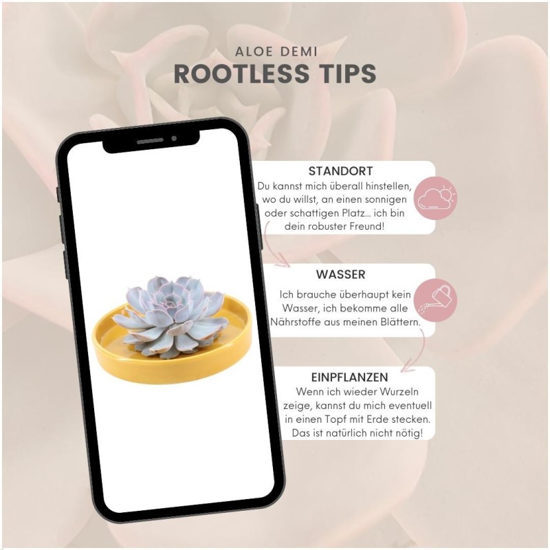 • ROOTLESS are succulents. And the name says it all: a ROOTLESS succulent has no roots. The plant consists of only a rosette. Moisture is stored in this heart of leaves. So you never give a ROOTLESS too much or too little water!