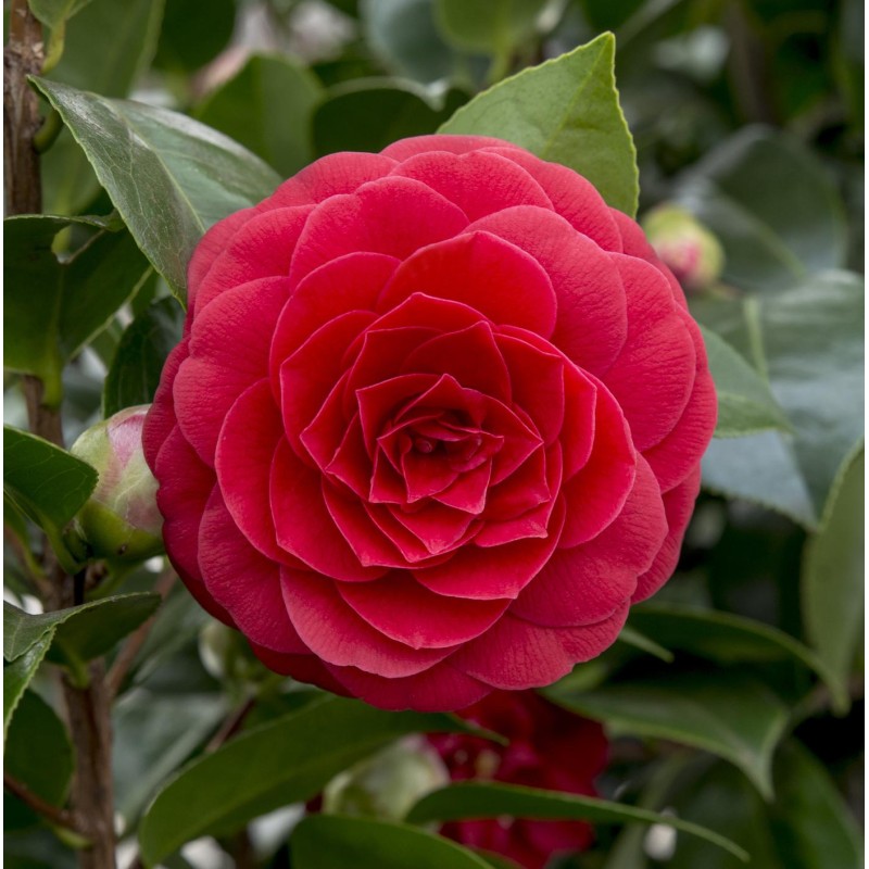 • The Camellia japonica 'Black Lace' is a stunning evergreen shrub with dark, glossy green leaves. The leaves are oval-shaped with slightly serrated edges, providing a lush contrast to its striking flowers.