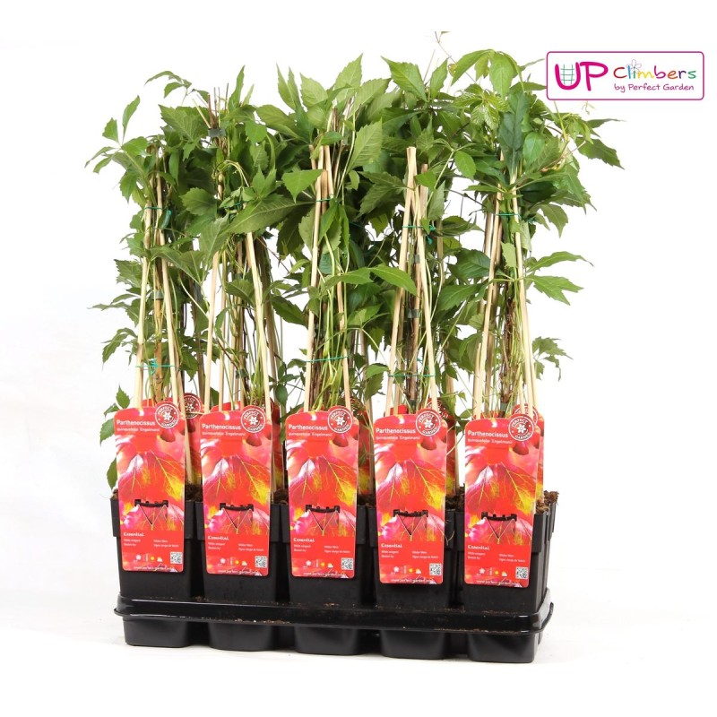 • 'Parthenocissus Quinquefolia Engelmannii', also called wild vine, is a fast growing, self-adhesive climber. It does not need to be tied up. The three-pointed leaf is green in summer and turns a beautiful bright red in autumn. Thanks to its strong adhesive roots, the vine grows quickly and securely against gables and fences. In winter, it loses its leaves but can survive severe winters. It is an easy plant that can stand in both the sun and the shade.