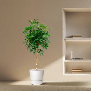 • Appearance of the plant: The Schefflera, also known as the Umbrella Plant, has elegant, hand-shaped leaves made up of multiple small, oval-shaped leaflets. The glossy green leaves give the plant a lush, tropical appearance.