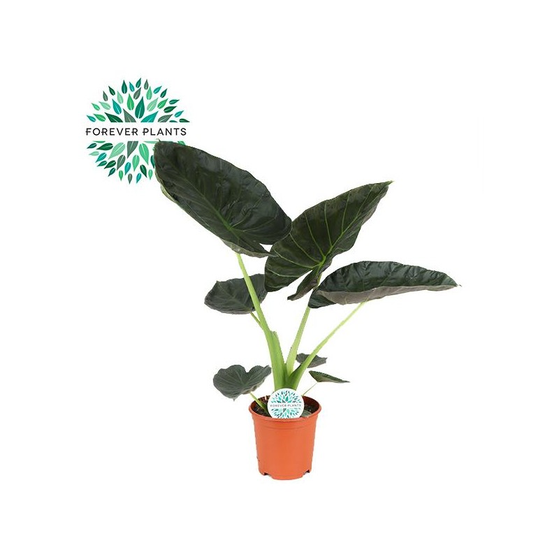 Appearance of the plant: The Alocasia Regal Shield features striking, heart-shaped leaves with a glossy, deep green color. The leaves are firm and have a rich texture with prominent, eye-catching veins that give off a metallic sheen. The plant has a robust appearance with an elegant shape, adding an exotic touch to any room.