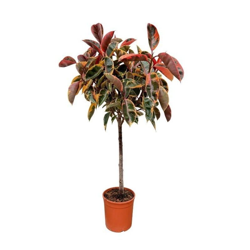 • The Ficus Elastica Robusta on a stem features large, glossy leaves with a deep green color.