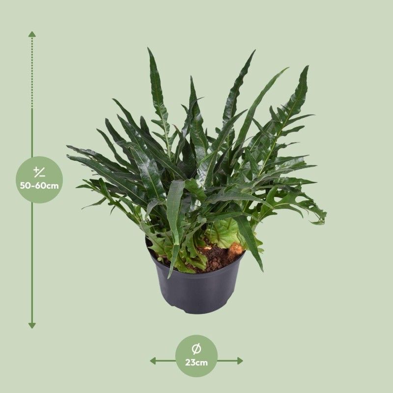 Discover the enchanting Aglaomorpha coronans, a captivating indoor plant that adds a touch of nature's charm to any space. Also referred to as the Santa Rosa Fern, this stunning specimen originates from tropical regions and thrives amidst moderate light conditions. Its elegantly arching fronds, adorned with delicate green foliage, create a mesmerizing display. With its easy-care nature, the Aglaomorpha coronans is perfect for both seasoned plant enthusiasts and beginners. Bring the allure of the Santa Rosa Fern into your home and immerse yourself in the tranquility it effortlessly exudes. Introducing the stunning Aglaomorpha coronans, a beautiful plant that can bring a touch of elegance to any space! This unique foliage thrives best in a spot with partial shade, making it an ideal addition to any indoor garden. With its easy-care nature, this plant only requires watering once per week, making maintenance a breeze. Its vibrant leaves and compact size make it a versatile choice for various settings. Elevate your interior decor effortlessly with the Aglaomorpha coronans, a low-maintenance plant with high aesthetic appeal. Order now and transform your space with this captivating beauty!Did you know that Aglaomorpha coronans, also known as the Deer's Foot Fern, is a popular choice for green thumbs looking to decorate their homes? With its lush, delicate fronds that resemble deer's hooves, this plant adds a touch of elegance to any space. However, it is essential to note that while Deer's Foot Ferns are captivating, they are not meant for consumption. So, enjoy the beauty of this plant, but leave the nibbling for other edible delights!- Aglaomorpha coronans has a pot size of 23 cm and reaches a height of around 60 cm.- This plant is also known as Santa Rosa Fern, adding an elegant touch to any indoor or outdoor space.- Aglaomorpha coronans prefers a spot in half shade, making it an ideal choice for areas with indirect sunlight.- One interesting fact about Aglaomorpha is its ability to remove harmful toxins from the air, enhancing the air quality in your space.- With its attractive foliage and air-purifying qualities, Aglaomorpha coronans is a popular choice among plant enthusiasts and a great addition to any green space.