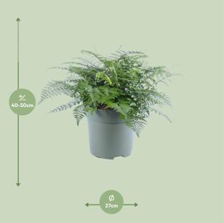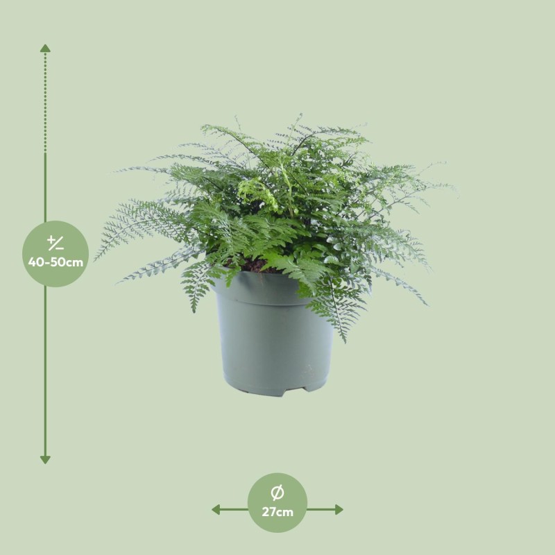 Introducing the Asplenium Parvati, also known as Spleenwort. This exquisite houseplant is perfect for indoor enthusiasts seeking a touch of nature in their living spaces. With its origins tracing back to tropical regions, this SEO-optimized indoor plant thrives in low-light conditions, making it the ideal companion for any room. The Asplenium Parvati boasts delicate fronds which gracefully arch, adding a touch of elegance to any interior. Bring the beauty of the outdoors into your home with this indoor plant, the Asplenium Parvati, also known as Spleenwort. Asplenium, commonly known as Spleenwort, thrives in a spot with half-shadow or shadow. It requires watering once per week to maintain its health and lush foliage. Spleenwort prefers well-drained soil with good organic matter. To provide optimal nutrition, it is recommended to fertilize the plant every 2-4 weeks during the growing season using a balanced, water-soluble fertilizer. However, it is important to avoid over-fertilization as it can cause damage to the delicate roots of the plant.Fun Fact: Asplenium undefined Parvati, also known as the Parvati fern, is a charming and vibrant plant that can instantly uplift any indoor or outdoor space. With its lush green fronds and delicate texture, it adds a touch of elegance to any decor. However, it's important to note that this plant is strictly for decoration purposes only. While there are many edible plants out there, the Parvati fern is not one of them. So, let's appreciate its beauty and let it thrive in our homes, knowing that it's not meant for our plates but for our eyes to feast upon.- Asplenium Parvati, also known as Spleenwort, is a popular indoor plant.- With a pot size of 27 cm, this plant is suitable for medium-sized spaces.- Standing at around 50 cm in height, Asplenium Parvati adds a touch of greenery to any room.- This plant thrives in partially shaded areas, making it perfect for spots in semi-shade.- Fun fact: Asplenium Parvati is known for its air-purifying qualities, helping to improve the air quality in your home or office.