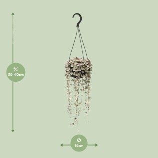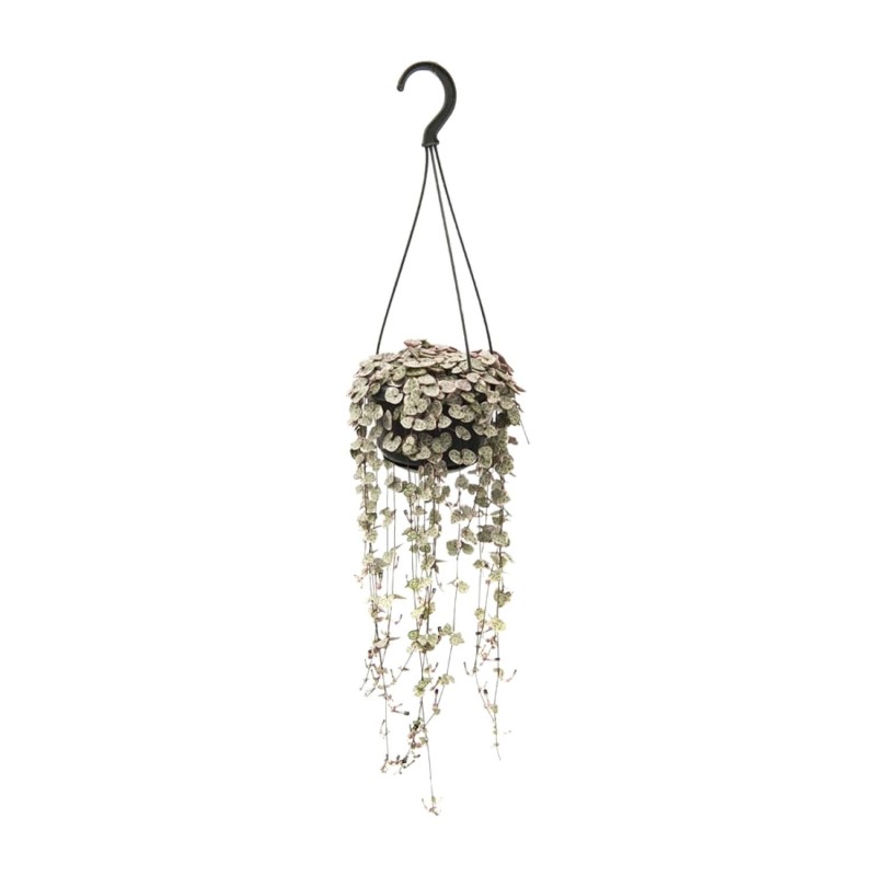 The Ceropegia woodii , commonly known as Ceropegia, is a captivating indoor plant that instantly adds a touch of elegance to any space. Originating from Southern Africa, this enchanting specimen thrives in low light conditions, making it perfect for brightening up dimly lit areas. Boasting cascading vines adorned with heart-shaped leaves, Ceropegia is a stunning addition to any plant collection. Its unique trailing nature makes it ideal for hanging baskets or cascading bookshelves. Bring a breath of fresh air into your home with this charming and effortlessly beautiful Ceropegia indoor plant. Introducing our exquisite Ceropegia woodii , a mesmerizing trailing succulent that will elevate any space with its unique beauty. This captivating plant thrives in a spot of partial shade, making it perfect for those looking to add greenery to their indoor or outdoor oasis. With its low-maintenance nature, it only requires watering once every 8-10 days, making it an ideal choice for busy plant enthusiasts. Bring home this stunning Ceropegia woodii  today and enjoy its enchanting presence for years to come. Experience nature's elegance effortlessly!Did you know that Ceropegia woodii , commonly known as the String of Hearts plant, is an incredible succulent with vines that resemble delicate strings of hearts? This charming plant is native to South Africa and is often used for decoration due to its elegant cascading foliage. However, it is essential to note that while it may capture your attention, Ceropegia woodii  is meant for ornamental purposes only and is not suitable for consumption. So, adore its beauty, but resist the temptation to snack on it, and let it flourish in your decor instead!- Ceropegia woodii  has a potsize of 14 cm.- The plant is approximately 38 cm high, making it a small and compact species.- Ceropegia woodii ssp. woodii is also known simply as Ceropegia.- This plant thrives in a spot with partial shade, making it suitable for indoor settings or outdoor areas with filtered sunlight.- A fun fact about Ceropegia is that its unique trailing vines with heart-shaped leaves have earned it nicknames like "String of Hearts" or "Rosary Vine."