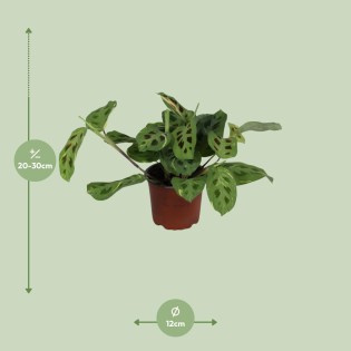 • - The Prayer plant, delivered in a 12 cm pot, is a beautiful addition to any indoor space.- With a current height of approximately 30 cm, this Prayer plant is ready to flourish in your home.- Perfect for a spot in half-shadow, this plant thrives in environments with moderate light levels.- Caring for the Prayer plant is a breeze, making it an ideal choice for beginners and busy individuals.- Its striking appearance, with intricately patterned leaves that fold up at night, adds a touch of elegance to any room.
