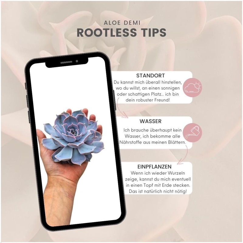 • ROOTLESS are succulents. And the name says it all: a ROOTLESS succulent has no roots. The plant consists of only a rosette. Moisture is stored in this heart of leaves. So you never give a ROOTLESS too much or too little water!