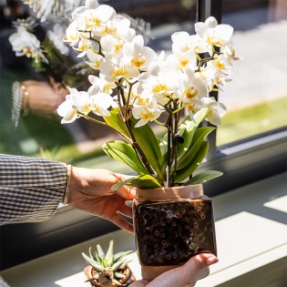 • Add warmth and style to your home with the Classy Cube pot in brown. This striking square pot combines an elegant gloss with a deep, rich colour and subtle seventies vibes. With its clean lines and bold presence, it’s the perfect decorative pot for anyone who loves a stylish interior with character. Available in two sizes – 6 cm and 9 cm – the Classy Cube offers space for both compact Kolibri Greens and full Kolibri Orchids. The glossy ceramic finish turns any plant into a true eye-catcher.