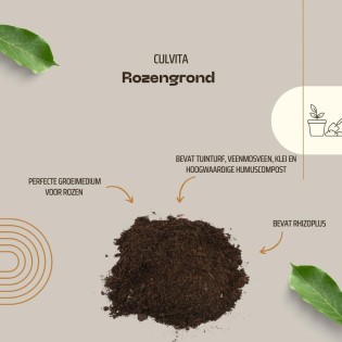 Culvita Rose Soil is a mixture of garden peat, peat moss peat, clay and high-quality humus compost. Besides an organic base fertiliser and lime, it contains RhizoPlus. RhizoPlus is a mixture of mycorrhiza and other rhizosphere bacteria and fungi. With the addition of RhizoPlus, food and water uptake will be faster and easier. In addition, RhizoPlus promotes natural balance.