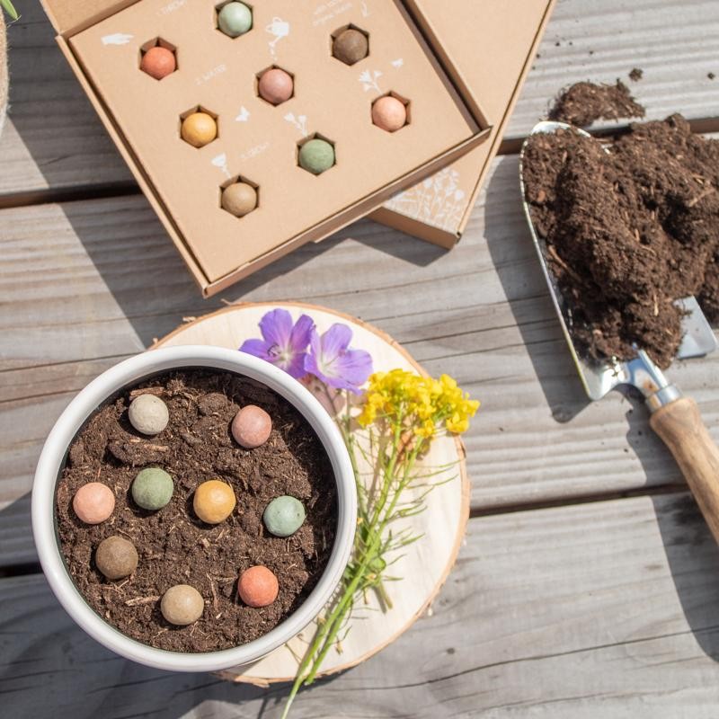 • Letterbox flower bombs – Bring color to the world! Who brightens up your life? Surprise them with these colourful seed bombs! Whether it’s a bare verge, an abandoned piece of green or a boring roundabout, everyone knows a place that could use some extra colour. With these seed bombs you can transform grey spots into a sea of ​​flowers! Scatter them, wait for a rain shower (or give them a little water) and enjoy a cheerful flower spectacle together with the whole neighbourhood. Of course you can also spread them in your own garden. Sow, water and voilà: your own picking garden! The stylish box contains 9 seed bombs, handmade in the Netherlands from 100% natural ingredients and filled with organic, wild flower seeds. Flowers are essential for our nature - the more flowers, the happier the bees, butterflies and bumblebees. Let’s spread some colour! The seeds in this letterbox gift include: Crimson clover | Greater mallow | Greater poppy | Small pimpernel | Cornflower | Coriander | Persian clover | Phacelia | Huttentut | White clover | Black cumin, Lemon yellow sweet clover | Yellow daisy | Wild chicory | Red clover | Chamomile Features Flower Bombs 9 colourful seed bombs – for an explosion of flowers! With organic, wild flower seeds – good for bees, butterflies and bumblebees. 100% natural ingredients – no artificial additives. Best sowing time: March to September.