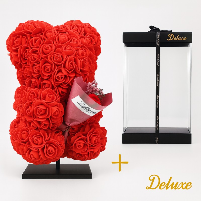 • Deluxe Bear On Stand 25 Cm – Red Foam With Bouquet – In Luxury Gift Packaging 25 Cm
