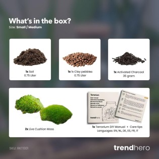 • With this starter & refill kit, you can completely refresh your terrarium! This DIY kit includes everything you need to create a plant terrarium from scratch or to revive your existing one. It’s specially put together for anyone looking to start a green project or give an old terrarium a second life. A plant terrarium is not only a stylish addition to your interior, but also a relaxing project to work on. Whether you’re making a gift, looking for some greenery for your home, or just enjoy being creative with plants – this kit gives you everything you need to get started right away. You can use it in all kinds of glass containers, such as bottles, jars, vases, or even plant pots. Whether you prefer a sleek design or a playful and natural effect, this kit helps you create a healthy and stable base for your plants. What’s in this plant terrarium kit? Fresh green cushion moss (2 pieces) Terrarium soil (0.75 liters) Clay pebbles (0.75 liters) Activated charcoal (35 grams) Terrarium step-by-step guide (languages: EN, DE, FR, NL, ES, IT) Terrarium care tips Suitable for bottles with a diameter between 10 cm and 20 cm.