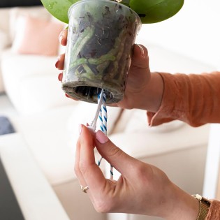 Step 2: Push the watering wick(s) into the bottom of the orchid's plastic growing pot until the wick has disappeared completely.